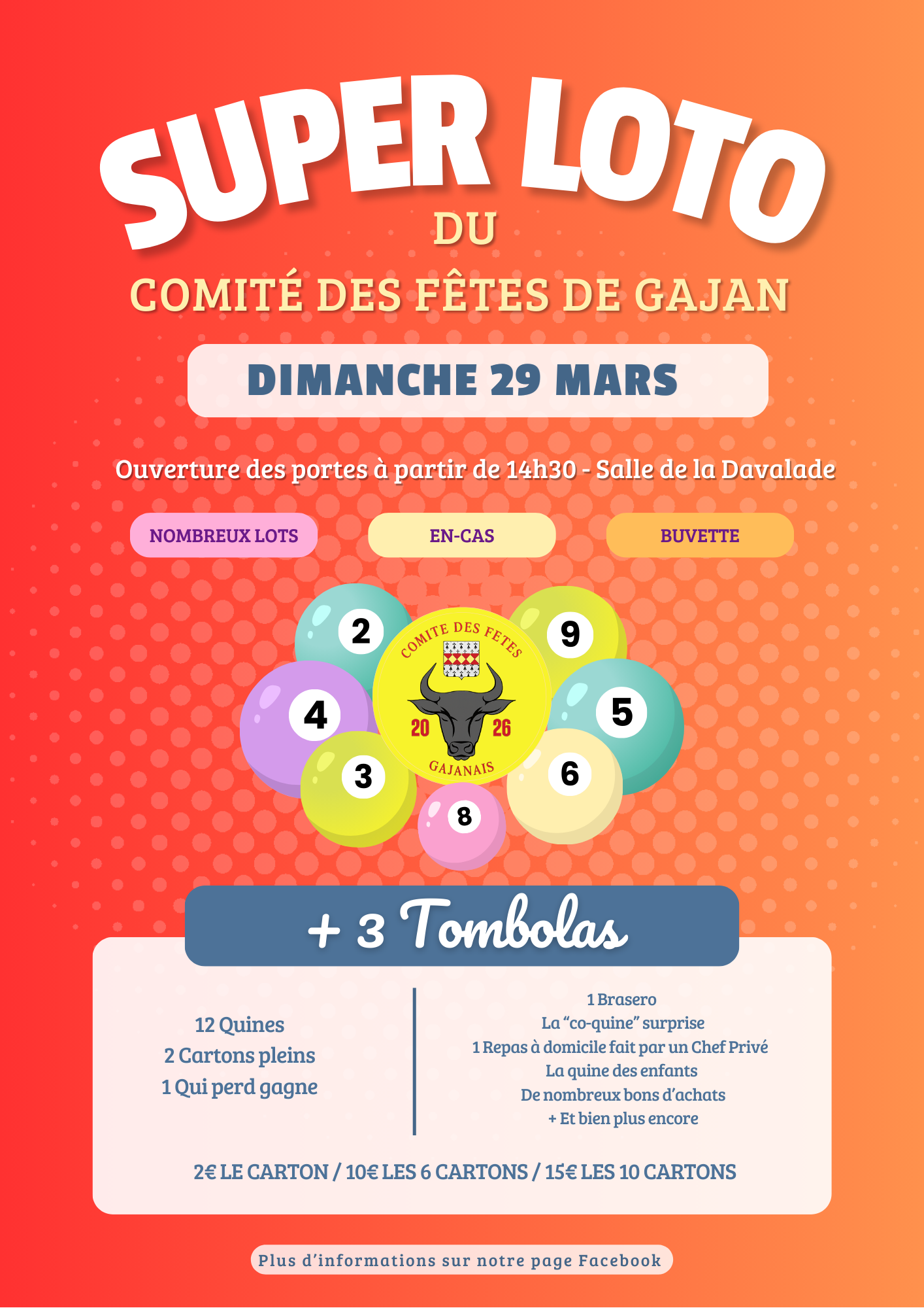 Prochains Évènements SUPER LOTO « Tous les Évènements 29 mars à 14 h 00 - 22 h 30 Détails Date : 29 mars Heure : 14 h 00 - 22 h 30 Organisateur Comité des Fêtes Lieu Espace la Davalade Gajan, 30730 France + Google Agenda+ Exporter vers iCal