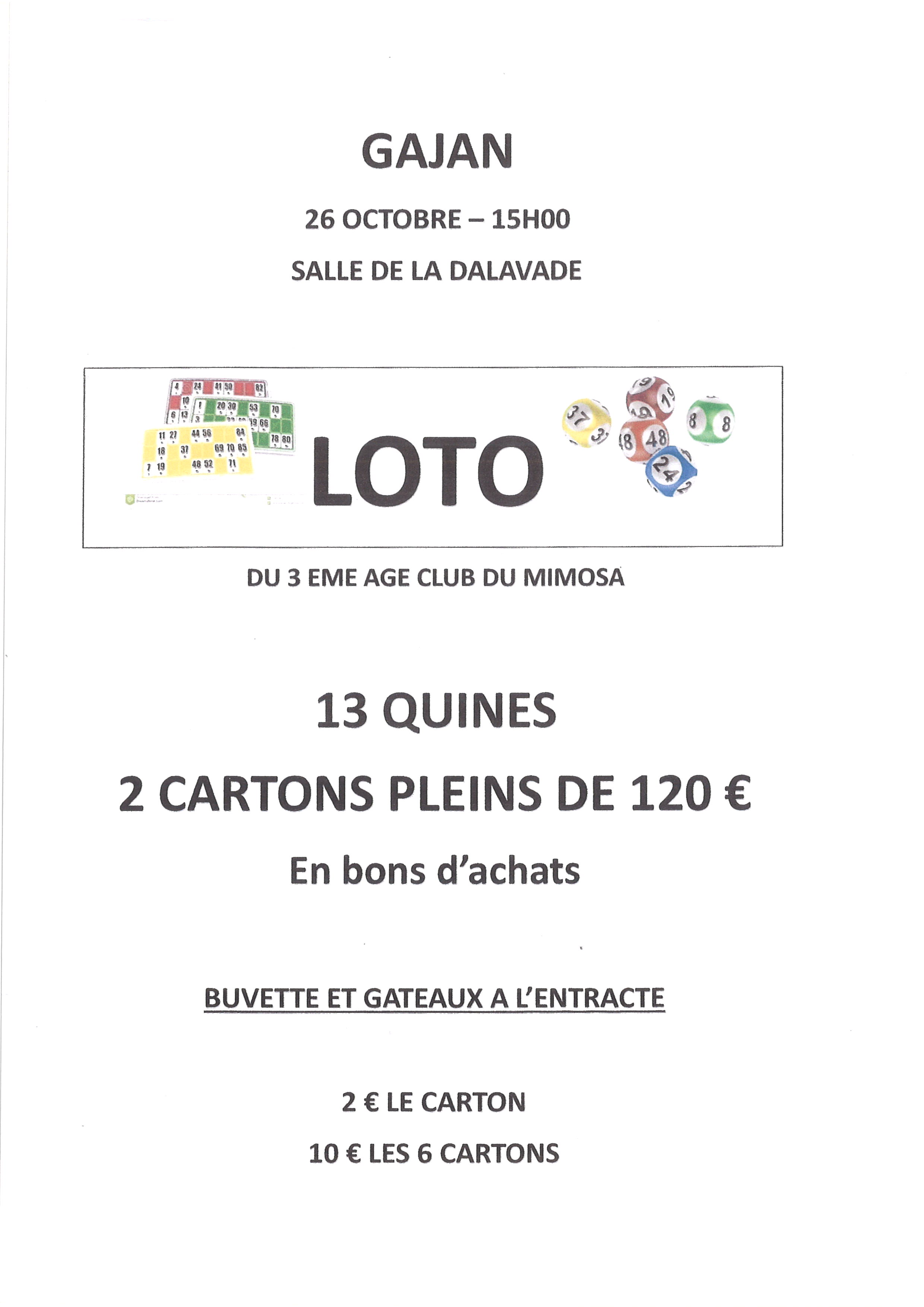 Prochains Évènements LOTO CLUB LE MIMOSA « Tous les Évènements 26 octobre à 15 h 00 - 20 h 00 Détails Date : 26 octobre Heure : 15 h 00 - 20 h 00 Organisateur Association Le Mimosa Lieu Espace la Davalade Gajan, 30730 France + Google Agenda+ Exporter vers iCal