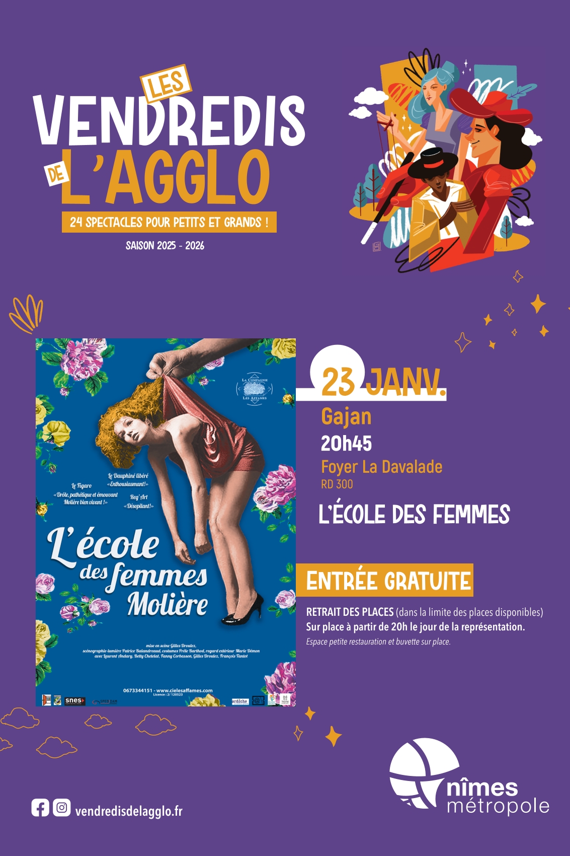 Prochains Évènements VENDREDIS DE L’AGGLO « Tous les Évènements 23 janvier à 20 h 00 - 22 h 30 Détails Date : 23 janvier Heure : 20 h 00 - 22 h 30 Organisateur Nîmes Métropole Lieu Espace la Davalade Gajan, 30730 France + Google Agenda+ Exporter vers iCal